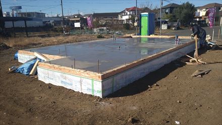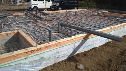 基礎工事もいよいよ終盤です。ポリブデン管を設置した上にコンクリートを流し平にならしていきます。