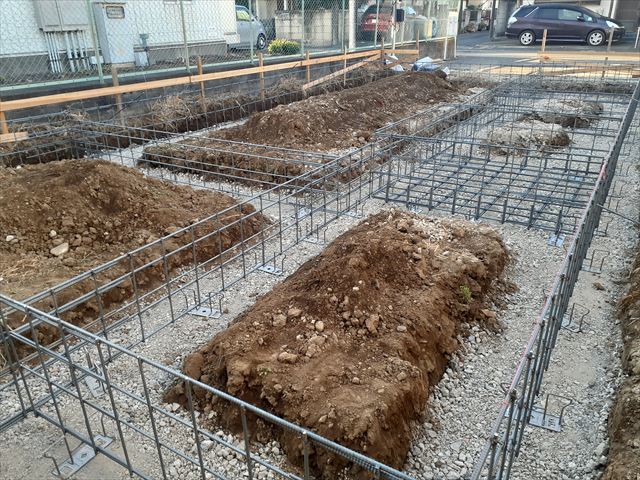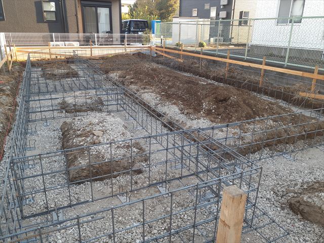 今回は、ユニバーサルホーム施工ですので、逆ベタ基礎になります。基礎屋さんがレーザーポインターで正確に配置を測って下さいます。それから、基礎を入れる為に土を少し掘り、砂利を敷き、土を入れ、鉄筋を組みます。正式名称ですと、遣り方(やりかた)、根伐り(ねぎり)、地業(じぎょう)、鉄筋組みとなります。
