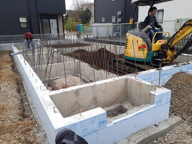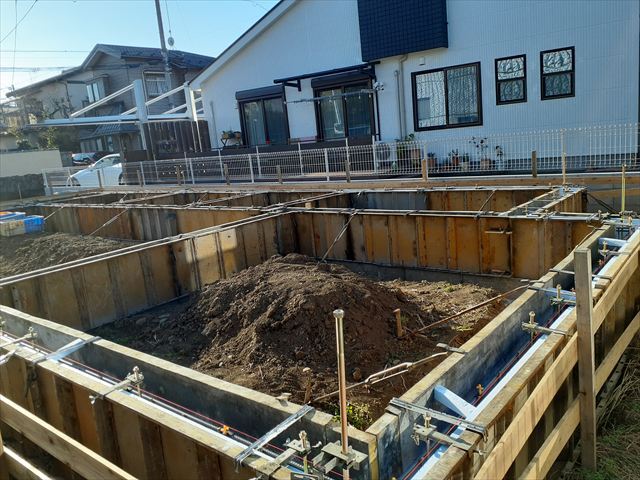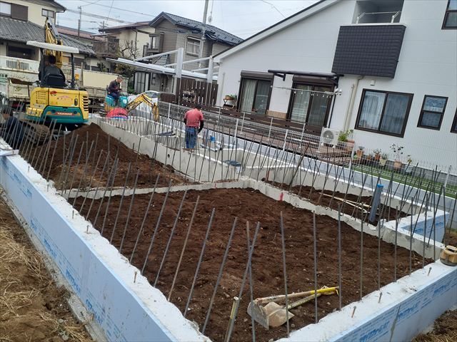 鉄筋組みが終わったら、型枠を組み、コンクリートを流します。型枠を組んだ段階で、ホールダウン金物という、基礎と建物をつなぐ役目の金物を配置します。水道も型枠の中に塩ビ管を入れておきます。3日程たちコンクリートが乾いたら型枠を外します。土入れ、砂利入れをし、中を埋めます。
