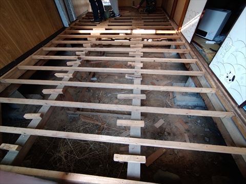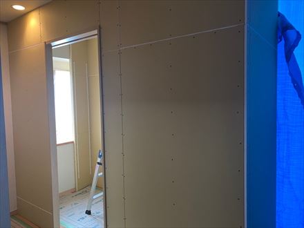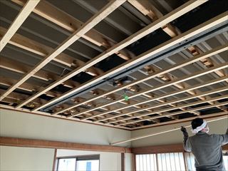 天井に断熱材を入れていきます。この後は石膏ボードを打ち付け、クロス仕上げにして終了です。